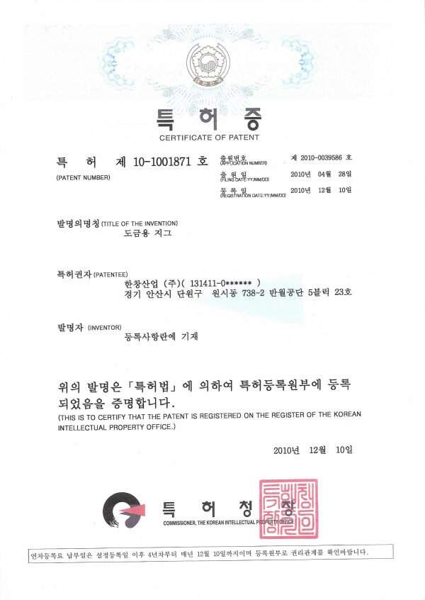특허증(도금용 지그) 페이지 정보 작성자 관리자 댓글 0건 조회 1,063회 작성일 20-08-21 12:25 본문 . 첨부파일 특허증도금용지그.pdf (154.3K) 47회 다운로드 | DATE : 2023-12-22 11:58:53 목록 이전글ISO14001 환경경영시스템 인증(한글,영문) 20.08.21 다음글지그 디자인등록증(경완철) 20.08.21